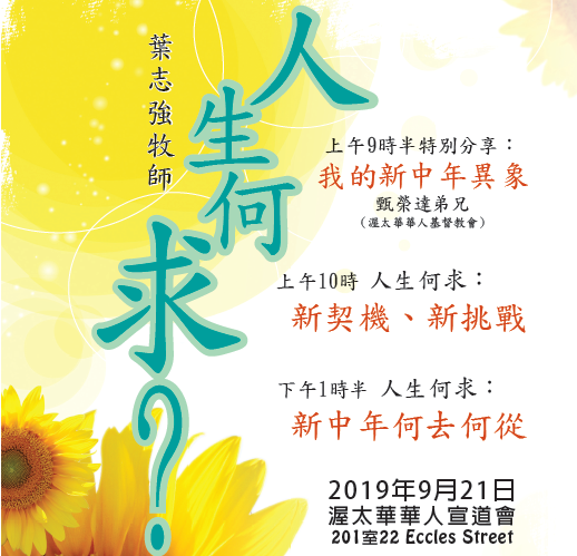 人 生 何 求 ? 新契機、新挑戰 Event Date: September 21, 2019 Time: 10:00 am Location: 渥太華華人宣道會 Address: 22 Eccles Street, Ottawa, Ontario K1R 6S2