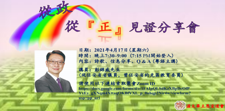 彭錦威省議員是一位多才多藝的議員,上月他剛在仕嘉堡宣道會主領棟篤笑佈道會, 這次彭議員將會再一次以風趣幽默及輕鬆愉快的形式,並以基督徒的身份來見證他從政的點滴. 他更會將基督的福氣與各人分享.請大家不要錯過這個難得的機會,邀請你的親朋戚友及街坊鄰舍參與這個網上盛會. 請使用以下連結報名,報名後我們將在大會前一天用電郵通知閣下聚會的Zoom連線.