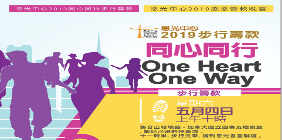 恩光中心2019同心同行步行籌款 Event Date: May 4, 2019 Time: 10:00 - 11:30 AM Location: Start from 395 Wellington Street, Ottawa; Address: Finish at 恩光中心