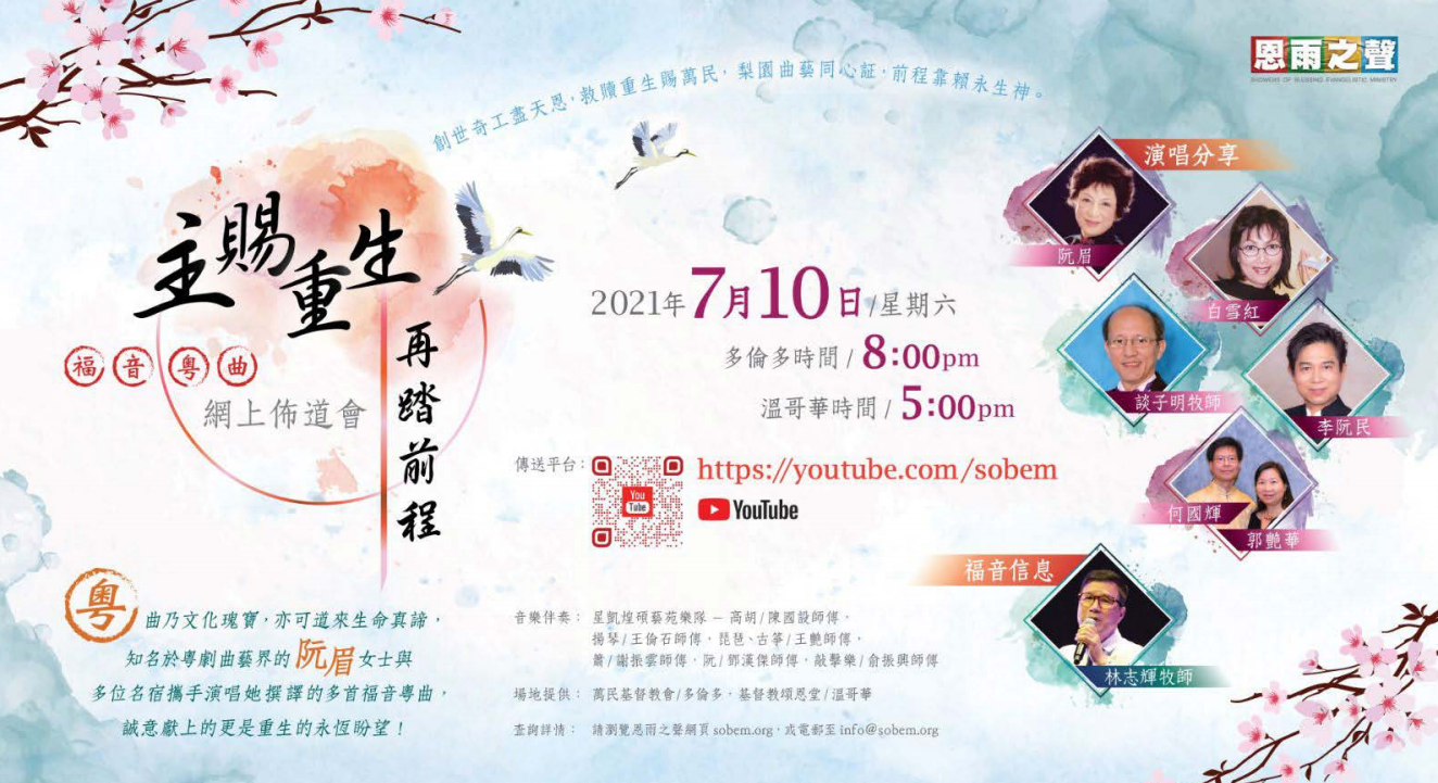 粵曲乃文化瑰寶,亦可道來生命真諦﹗恩雨之聲將於 7 月 10 日(星期六) 晚上舉辦「主賜重生再踏前程」福音粵曲網上佈道會,由著名粵劇曲藝界的阮眉女士與多位名宿攜手 演出多首福音粵曲,將於 YouTube Live 直播,誠意獻上的更是重生的永恆盼望﹗